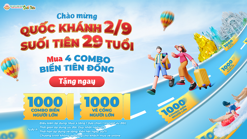 Chương trình ưu đãi đầu tiên chính là KDL Suối Tiên sẽ tặng miễn phí 1.000 vé combo Biển Tiên Đồng dành cho người lớn, có giá trị sử dụng trong ngày 2/9. Theo đó, du khách đến đầu tiên trong ngày mua 4 vé combo Biển Tiên Đồng người lớn/trẻ em sẽ được tặng 1 vé combo Biển Tiên Đồng trị giá 320.000 đồng.