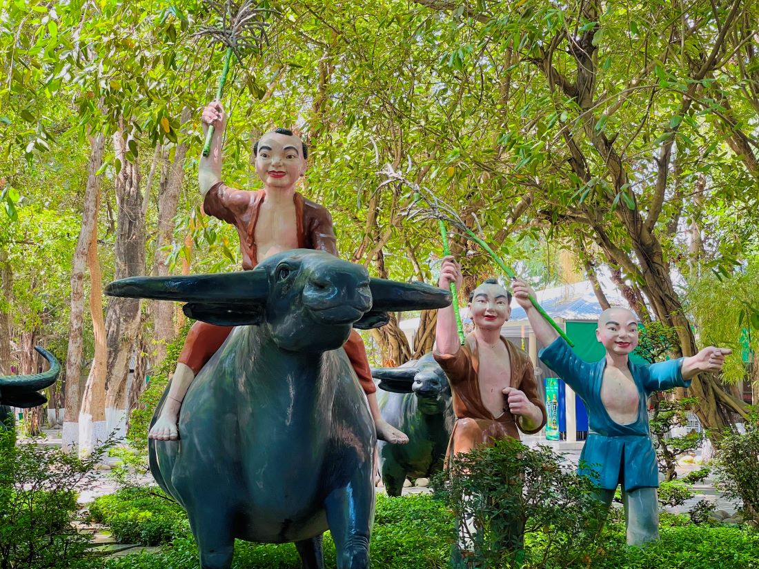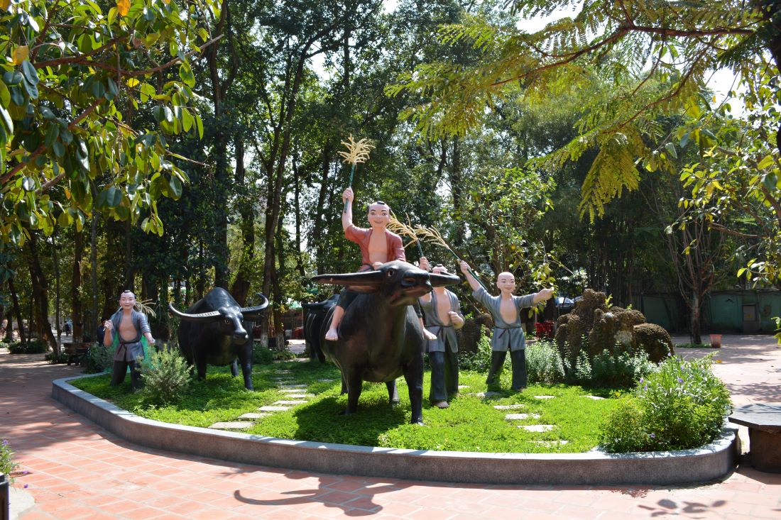 Cụm tượng “Đinh Bộ Lĩnh - Cờ lau tập trận” hình ảnh thời niên thiếu của vua Đinh Tiên Hoàng. Khi còn là một cậu bé chăn trâu, Đinh Bộ Lĩnh đã tụ tập trẻ mục đồng bẻ bông lau làm cờ tập trận. Cậu bé nhanh chóng chiếm được lòng tin của chúng bạn và đã được bạn bè tôn làm "chủ tướng".Đinh Tiên Hoàng là vị vua sáng lập triều đại nhà Đinh nước Đại Cồ Việt trong lịch sử Việt Nam. Ông là người có công đánh dẹp loạn 12 Sứ Quân thống nhất giang sơn và trở thành hoàng đế đầu tiên của Việt Nam sau 1000 năm Bắc Thuộc. Đinh Tiên Hoàng là vị hoàng đế đặt nền móng sáng lập nhà nước phong kiến trung ương tập quyền đầu tiên ở Việt Nam.