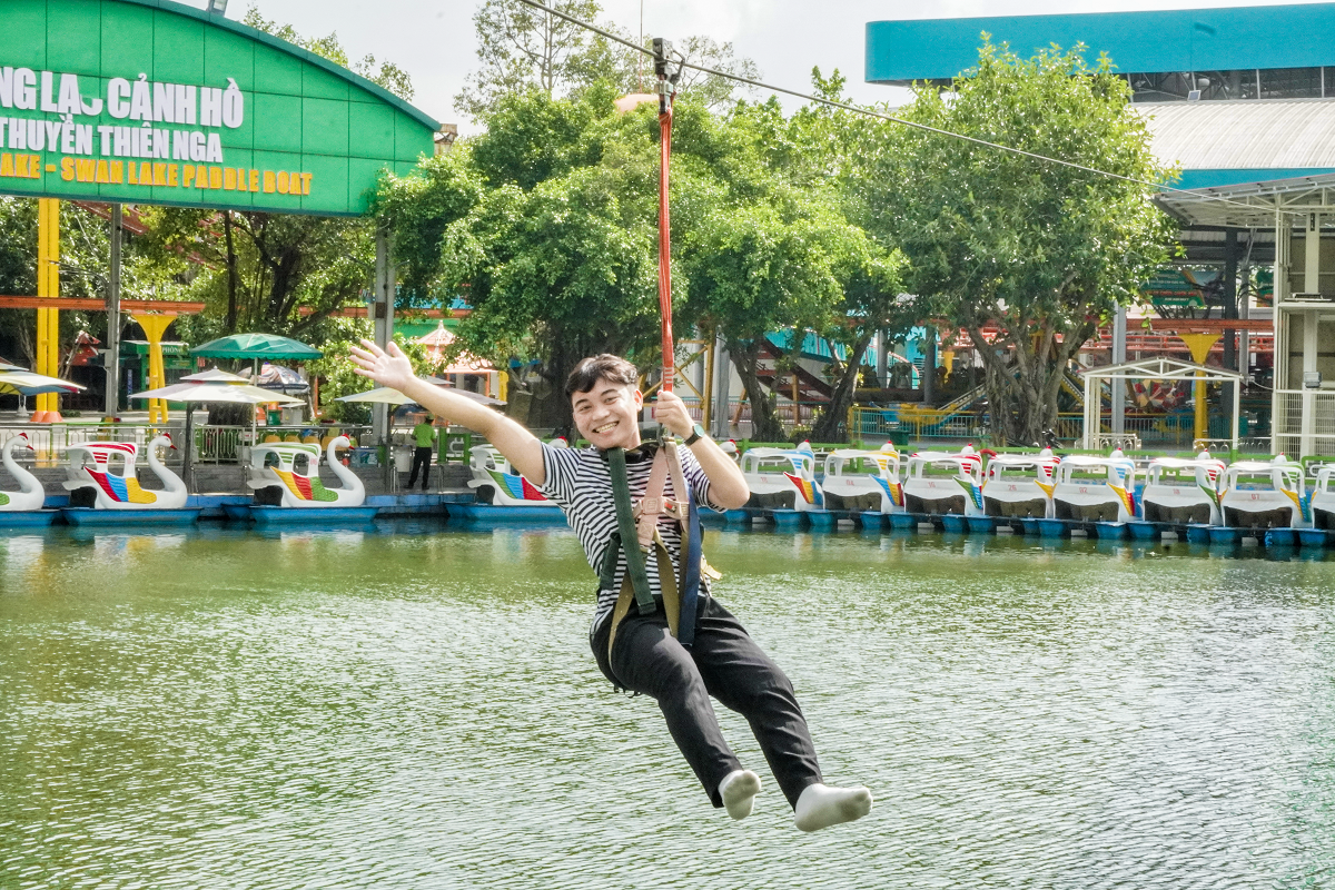 Quý khách sẽ trải nghiệm cảm giác thú vị khi đi bộ thăng bằng trên dây treo lơ lửng, sau đó thử thách hấp dẫn khi đu dây mạo hiểm vượt qua Hồ Lạc Cảnh trở lại điểm xuất phát.