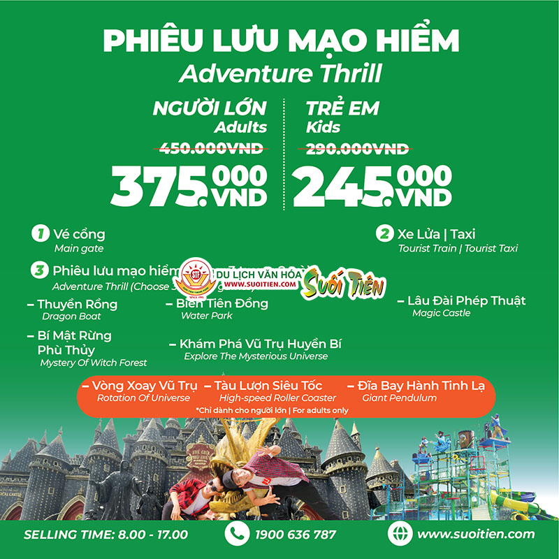 Nếu bạn muốn trải nghiệm nhiều trò chơi hơn thì combo Phiêu Lưu Mạo Hiểm là lựa chọn tuyệt vời với giá 375.000 VNĐ cho người lớn và 245.000 VNĐ cho trẻ em.