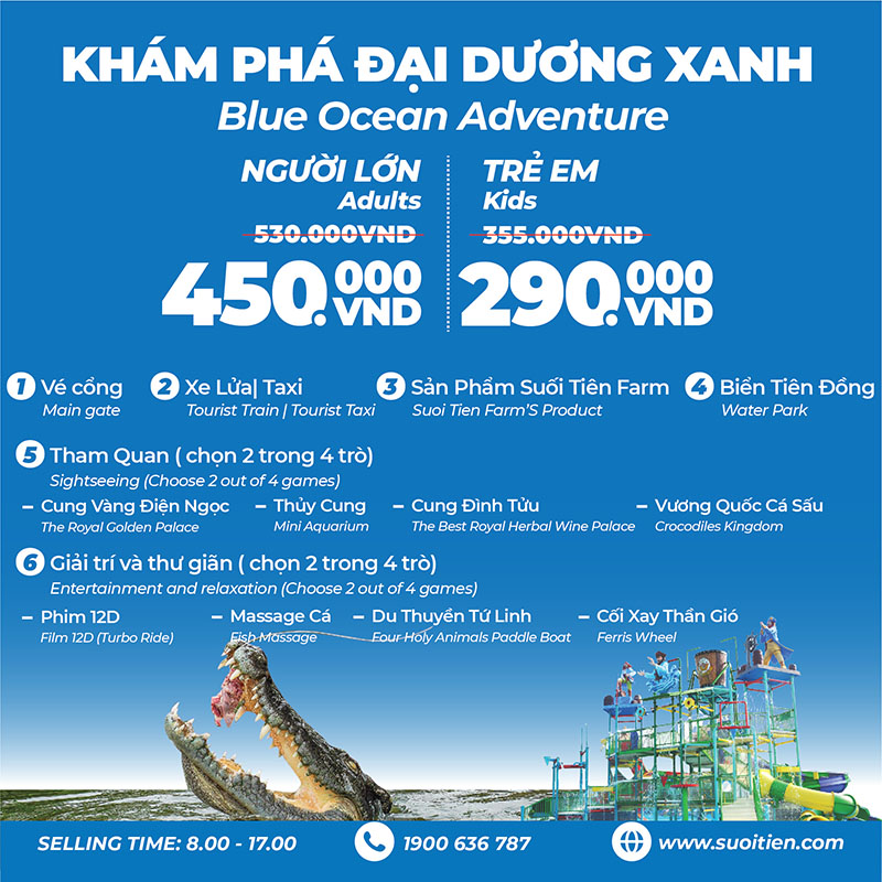 Hoặc bạn cũng có thể tham khảo combo Khám Phá Đại Dương Xanh với mức giá 450.00VNĐ với người lớn và 290.000VNĐ với trẻ em