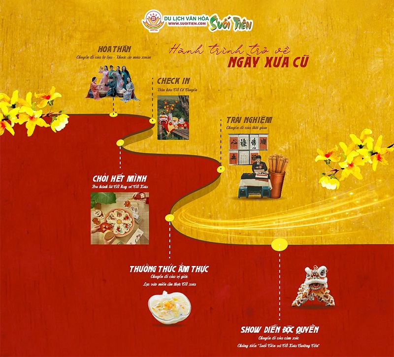 Ngoài việc tham gia các hoạt động tái hiện Tết xưa đầy ý nghĩa, khi sở hữu vé Combo "Tết Xuyên Không", du khách còn được tự do tham quan các công trình biểu tượng tại Suối Tiên, nơi từng ngõ ngách đều ẩn chứa những câu chuyện văn hóa đặc sắc. Hơn thế, bạn còn có cơ hội trải nghiệm các trò chơi giải trí độc đáo với giá vé ưu đãi, đặc biệt là chuyến hành trình trên tàu siêu tốc quay về tuổi thơ, nơi cảm xúc bồi hồi như được sống lại những ngày xưa hồn nhiên. Hãy để mỗi khoảnh khắc tại Suối Tiên trở thành một ký ức khó phai trong mùa Tết này!