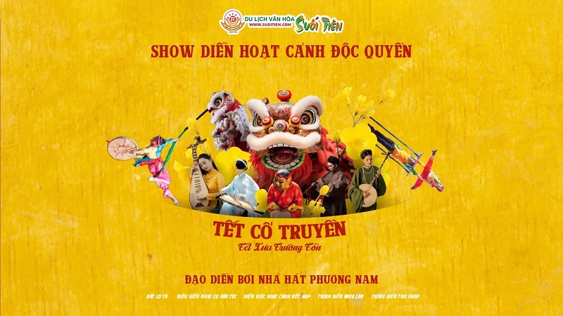 Show độc quyền “Suối Tiên – Tết Xưa Trường Tồn” là một đại cảnh trình diễn sống động, nơi các tiết mục như xiếc, múa dân vũ, bắn pháo hoa,... hòa quyện trên nền nhạc cụ truyền thống của Việt Nam. Mỗi màn trình diễn sẽ khiến bạn cảm nhận rõ nét không khí Tết xưa, mạnh mẽ và đầy cảm xúc, đưa người xem vào một hành trình không thể quên, tái hiện đậm đà bản sắc văn hóa dân tộc Việt.