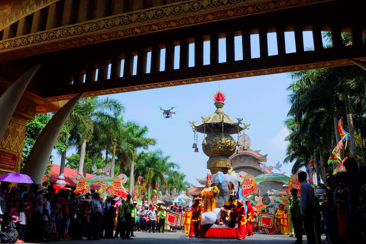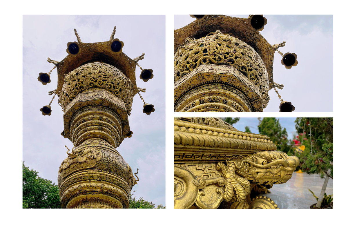 Thiên Đăng cao 18m với nhiều họa tiết, điêu khắc cổ được thếp đồng rực rỡ luôn xoay chuyển tỏa sáng khắp mười phương tám hướng.