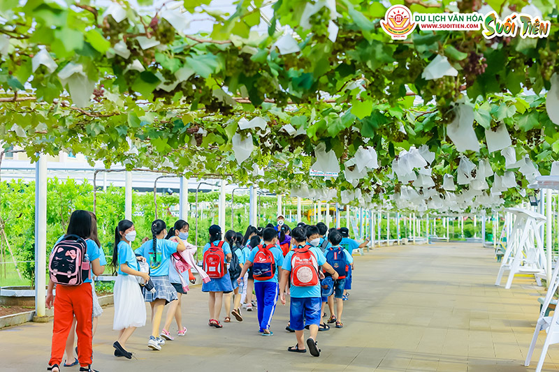 Suối Tiên Farm rộng hơn 5ha, sở hữu hơn 31 giống cây ăn trái có nguồn gốc từ các nước trên thế giới đang vào mùa thu hoạch Nho kẹo đen Pháp.