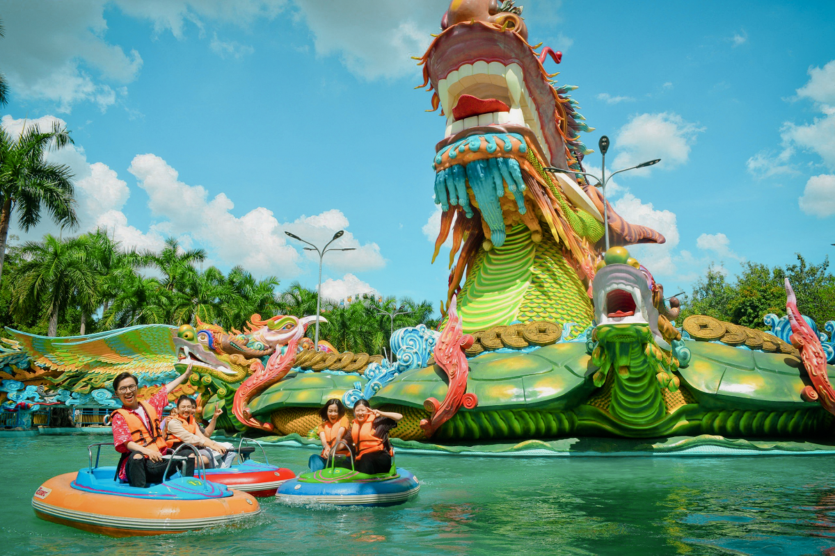 Đầu Rồng khổng lồ cao 25m, nặng trên 300 tấn, luôn ngẩng cao đầu hùng dũng uy nghi chào đón mọi người cùng về sum vầy, đoàn tụ. Quý khách có thể thưởng ngoạn bằng thuyền trên dòng sông êm đềm thơ mộng. Hoặc có thể tản bộ đến đảo Qui qua lòng ba cây cầu: cầu Loan, cầu Phụng, cầu Lân thăm giếng ngọc Lưu Ly, đền Rồng Vạn Bảo.
